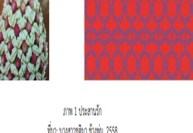 การศึกษาภูมิปัญญางานดอกไม้สดและใบตองประณีตศิลป์ เพื่อใช้ในการออกแบบลวดลายและเครื่องประกอบการแต่งกายสตรี เจ้าของผลงาน : ชุติมา ช้างพุ่ม คำสำคัญ : ภูมิปัญญางานดอกไม้สด, การออกแบบลวดลาย, เครื่องประกอบการแต่งกายสตรี วันที่เผยแพร่ : 23 เมษายน 2562