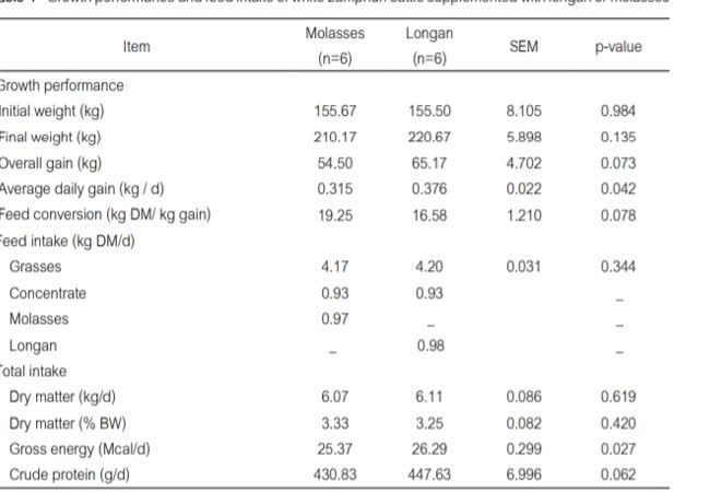 สมรรถนะการเจริญเติบโต, โคขาวลำพูน, ผลลำไย, กากน้ำตาล