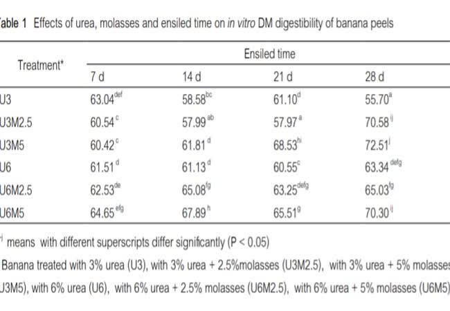 เปลือกกล้วย, แพะ, การย่อยได้, ยูเรีย, กากน้ำตาล