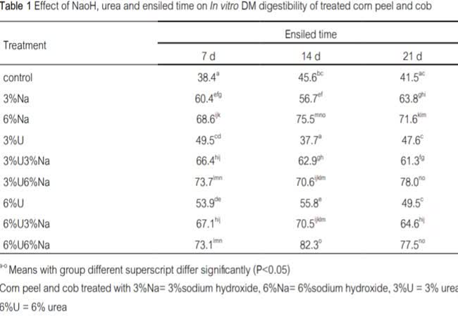 เปลือกพร้อมซังข้าวโพด, ยูเรีย, โซเดียมไฮดรอกไซด์, การย่อยได้, แพะ