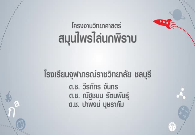 โครงงานวิทยาศาสตร์ สมุนไพรไล่นกพิราบ เจ้าของผลงาน : วีรภัทร จันทร คำสำคัญ : สมุนไพรไล่นกพิราบ, น้ำพริกสมุนไพร วันที่เผยแพร่ : 30 กรกฎาคม 2562