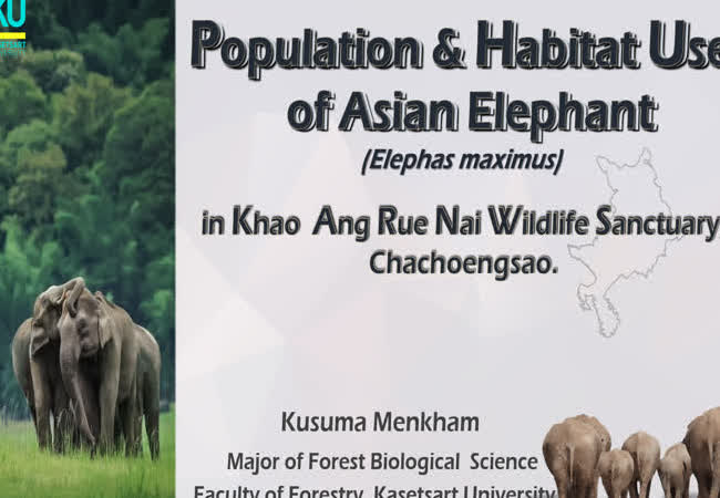 Population and Habitat Use of Asian Elephants (Elephas maximus) in Khao Ang Rue Nai Wildlife Sanctuary, Chachoengsao Province, Thailand เจ้าของผลงาน : กุสุมา เม่นขำ คำสำคัญ : ช้างป่า (Elephas maximus), ประชากร, การใช้พื้นที่อาศัย, เขตรักษาพันธุ์สัตว์ป่า เขาอ่างฤาไน จังหวัดฉะเชิงเทรา, Asian Elephants, Population, Habitat Use, Khao Ang Rue Nai Wildlife Sanctuary, Chachoengsao Province วันที่เผยแพร่ : 27 สิงหาคม 2562