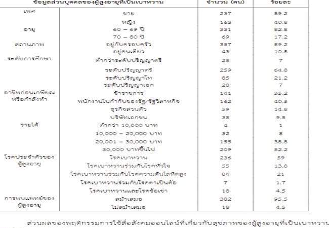 พฤติกรรมการใช้สื่อสังคมออนไลน์ที่เกี่ยวกับสุขภาพกับการรู้เท่าทันสื่อของผู้สูงอายุที่เป็นเบาหวานในเขตกรุงเทพมหานคร เจ้าของผลงาน : กนิษฐา เทพสุด คำสำคัญ : พฤติกรรมการใช้สื่อสังคมออนไลน์, การ์ตูนเท่าทันสื่อ, สุขภาพ, ผู้สูงอายุ วันที่เผยแพร่ : 8 ตุลาคม 2562