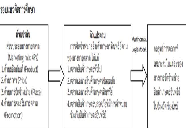 กลยุทธ์ทางการตลาดที่เหมาะสมสำหรับช่องทางการจัดจำหน่ายสินค้าเกษตรอินทรีย์ในจังหวัดเชียงใหม่ เจ้าของผลงาน : พัชรินทร์ สุภาพันธ์ คำสำคัญ : กลยุทธ์ทางการตลาด, สินค้าเกษตรอินทรีย์, แบบจำลองโลจิตหลายทางเลือก วันที่เผยแพร่ : 25 พฤศจิกายน 2562