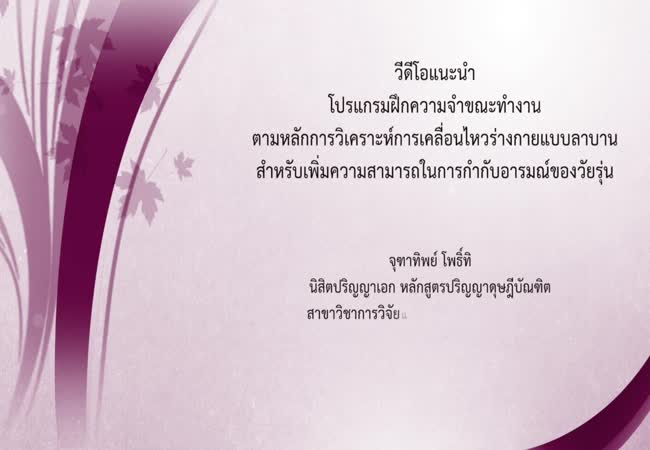การพัฒนาโปรแกรมฝึกความจำขณะทำงานตามหลักการวิเคราะห์การเคลื่อนไหวร่างกาย แบบลาบาน สำหรับเพิ่มความสามารถในการกำกับอารมณ์ของวัยรุ่น: การศึกษาเชิงพฤติกรรมและคลื่นไฟฟ้าสมอง เจ้าของผลงาน : จุฑาทิพย์ โพธิ์ทิ คำสำคัญ : การกำกับอารมณ์/ ความจำขณะทำงาน/ การเคลื่อนไหวร่างกายแบบลาบาน/ กิจกรรมทดสอบการกำกับอารมณ์/ คลื่นไฟฟ้าสมอง วันที่เผยแพร่ : 11 ธันวาคม 2562