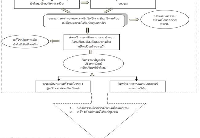การพัฒนาต่อยอดองค์ความรู้ในการผลิตผ้าไหมย้อมสีด้วยเมล็ดมะขามเพื่อเพิ่มมูลค่าเชิงพาณิชย์:กรณีศึกษาผ้าขาวม้า บ้านทัพกระบือ ตำบลสำโรง อำเภอเมือง จังหวัดสุรินทร์ เจ้าของผลงาน : อรนุช นาคชาติ คำสำคัญ : ผ้าไหม, ผ้าขาวม้า, เมล็ดมะขาม วันที่เผยแพร่ : 28 มกราคม 2563
