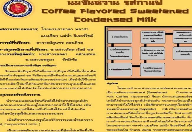 นมข้นหวานรสกาแฟ เจ้าของผลงาน : ชลลดา คล้ายสอน คำสำคัญ : นมข้นหวาน, แปรรูปอาหาร, นม, กาแฟ วันที่เผยแพร่ : 1 เมษายน 2563