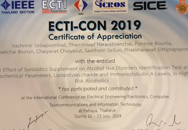 The Effect of Synbiotics Supplement on Alcohol Use Disorders Identification Test and Biochemical Parameters, Lipopolysaccharide and Immunoglobulin A Levels, in High Risk Alcoholics เจ้าของผลงาน : Vachrintr Sirisapsombat คำสำคัญ : Synbiotics, Gut-Brain, Alcoholics, AUDIT วันที่เผยแพร่ : 26 สิงหาคม 2563