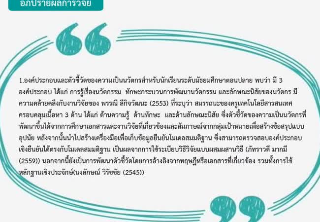 การพัฒนาชุดเครื่องมือประเมินความเป็นนวัตกรสำหรับนักเรียนระดับ มัธยมศึกษาตอนปลายในภาคตะวันออกเฉียงเหนือ : การวิจัยแบบผสมผสานวิธี. เจ้าของผลงาน : คนึงนิตย์ ทนทาน คำสำคัญ : การรู้เรื่องนวัตกรรม ทักษะกระบวนการพัฒนานวัตกรรม ลักษณะนิสัยของนวัตกร นวัตกร วันที่เผยแพร่ : 23 มีนาคม 2564