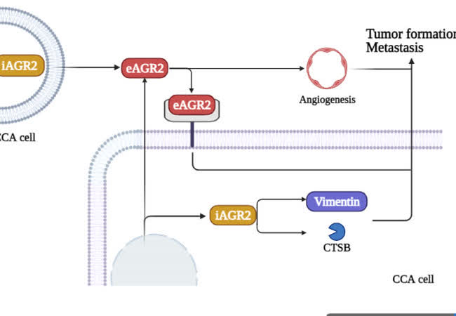 Roles of extracellular anterior gradient 2 (eAGR2) on metastasis of cholangiocarcinoma เจ้าของผลงาน : Kanyanut Insawang คำสำคัญ : Cholangiocarcinoma (CCA), extracellular anterior gradient 2 (eAGR2), metastasis วันที่เผยแพร่ : 4 มิถุนายน 2564