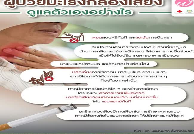 ผู้ป่วยมะเร็งกล่องเสียงดูแลตังเองอย่างไร เจ้าของผลงาน : ณปฎล ตั้งจาตุรนต์รัศมี คำสำคัญ : มะเร็งกล่องเสียง วันที่เผยแพร่ : 17 สิงหาคม 2564