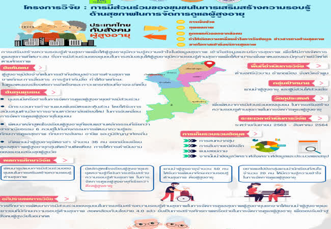 การมีส่วนร่วมของชุมชนในการเสริมสร้างความรอบรู้ด้านสุขภาพในการจัดการดูแลผู้สูงอายุ เจ้าของผลงาน : ผศ.ดร. รังสิยา นารินทร์ คำสำคัญ : การมีส่วนร่วม การเสริมสร้างความรอบรู้ ผู้สูงอายุ การวิจัยและพัฒนา ชุมชน วันที่เผยแพร่ : 8 กันยายน 2564