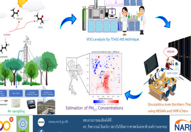 แหล่งกำเนิดอนุภาคฝุ่นทุติยภูมิและกลไกการเกิดฝุ่นละอองขนาดไม่เกิน 2.5 ไมครอน จากปฏิกิริยาฟิสิกส์เคมีของสารอินทรีย์ระเหยง่ายทางชีวภาพเหนือเรือนยอดป่าไม้ในภาคเหนือ เจ้าของผลงาน : ดร. รัชดาภรณ์ จันทร์ถา คำสำคัญ : Biogenic Volatile Organic Compounds, PM2.5, Secondary Organic Aerosol, WRF-Chem, MEGAN, Forest in Northern Thailand วันที่เผยแพร่ : 8 สิงหาคม 2565