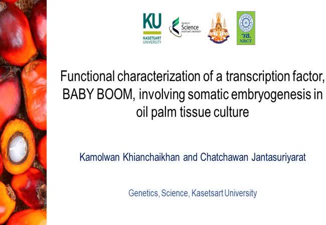 การศึกษาหน้าที่ของ BABY BOOM และ HOMEODOMAIN LEUCINE ZIPPER IV ที่ควบคุมกระบวนการพัฒนาเป็นต้นอ่อนของปาล์มน้ำมันในการเพาะเลี้ยงเนื้อเยื่อ เจ้าของผลงาน : กมลวรรณ เขียนไชยขันธ์ คำสำคัญ : BABY BOOM, HD-ZIP IV, Somatic embryogenesis, Oil palm วันที่เผยแพร่ : 8 พฤษภาคม 2566
