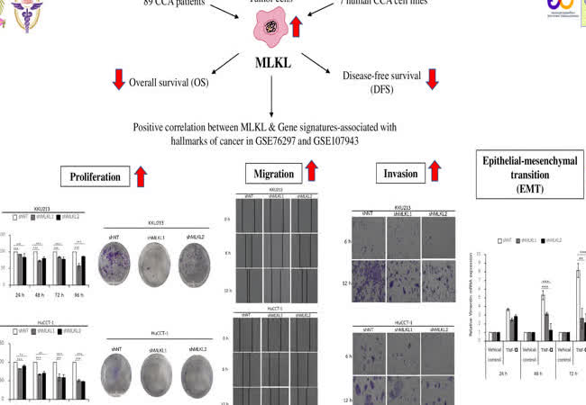 การส่งเสริมมะเร็งของโปรตีนมิกซ์ลินเนจไคเนสโดเมนไลค์ในเซลล์มะเร็งท่อน้ำดี เจ้าของผลงาน : ณัฐธยาน์ ดวงทิม คำสำคัญ : cholangiocarcinoma (CCA), mixed lineage kinase domain-like (MLKL), protumorigenic effects, proliferation, migration, invasion วันที่เผยแพร่ : 29 พฤศจิกายน 2565