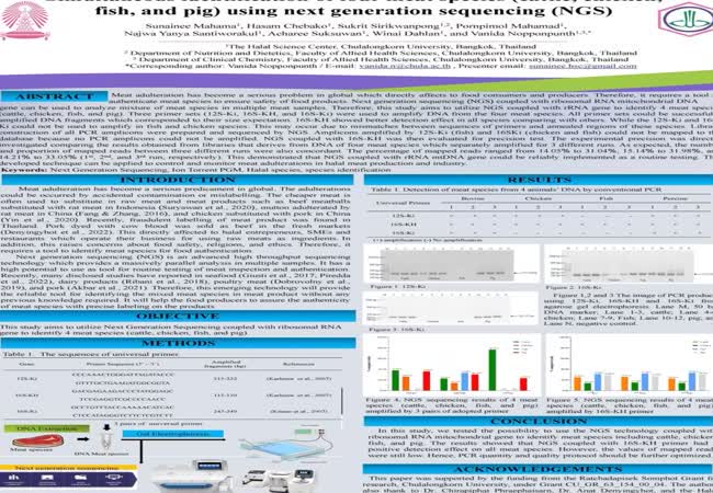 การระบุเนื้อสัตว์สี่ชนิดพร้อมกัน (วัว ไก่ ปลา และหมู) โดยใช้ Next Generation Sequencing (NGS) เจ้าของผลงาน : ซูไนนี มาหะมะ, ฮาซัม เจะบากอ คำสำคัญ : Next Generation Sequencing, Ion Torrent PGM, Halal species, meat species identification, ribosomal RNA วันที่เผยแพร่ : 11 พฤษภาคม 2566