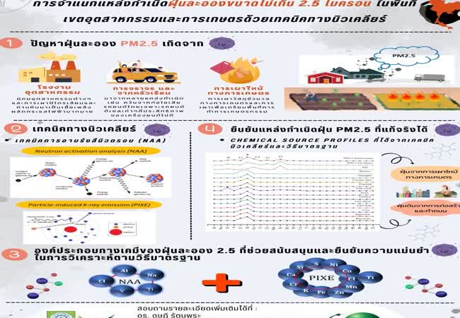 การจำแนกแหล่งกำเนิดฝุ่นละอองขนาดไม่เกิน 2.5 ไมครอน ในพื้นที่เขตอุตสาหกรรมและการเกษตรด้วยเทคนิคทางนิวเคลียร์ เจ้าของผลงาน : ดร. ดุษฎี รัตนพระ คำสำคัญ : เทคนิคการอาบรังสีนิวตรอน, เทคนิคการเหนี่ยวนำอนุภาคให้ปลดปล่อยรังสีเอ็กซ์, ฝุ่นละออง PM2.5, แหล่งกำเนิดฝุ่นละออง วันที่เผยแพร่ : 11 กรกฎาคม 2566