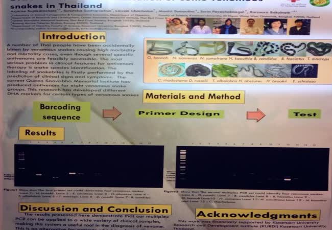 Molecular Barcoding of Fifteen Venomous Snakes, and Identification Eight Snake Groups in Thailand Using Multiplex PCR. เจ้าของผลงาน : Arjaree คำสำคัญ : Snake,Barcode,Mitochondrial DNA,Multiplex PCR,Venom,Saliva, Lawan Chanhome วันที่เผยแพร่ : 7 กันยายน 2559
