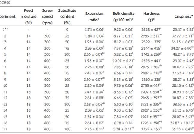 ข้าวโพดบดหยาบ, แป้งดัดแปร, กระบวนการเอกซ์ทรูชัน, สมบัติทางกายภาพ, ผลิตภัณฑ์ขนมขบเคี้ยว