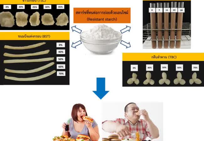 การพัฒนาผลิตภัณฑ์อาหารว่างและเครื่องดื่มเสริมสตาร์ชที่ทนต่อการย่อยด้วยเอนไซม์สำหรับผู้ที่มีภาวะน้ำหนักเกินและอ้วน เจ้าของผลงาน : จารุเนตร เพ็ชรชู คำสำคัญ : สตาร์ชที่ทนต่อการย่อยด้วยเอนไซม์, อาหารว่าง, การแทนที่แป้ง, ค่าดัชนีน้ำตาล, ภาวะน้ำหนักเกินและโรคอ้วน วันที่เผยแพร่ : 16 พฤษภาคม 2561