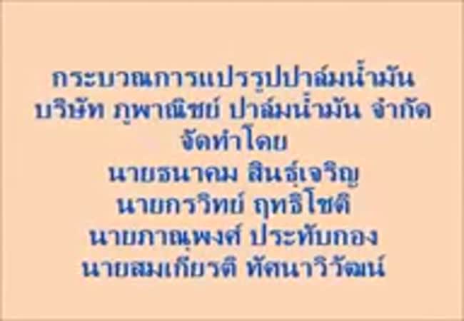 กระบวณการแปรรูปปาล์มน้ำมัน เจ้าของผลงาน : ธนาคม สินธุ์เจริญ คำสำคัญ : กระบวณการแปรรูป, ปาล์มน้ำมัน วันที่เผยแพร่ : 5 ตุลาคม 2558