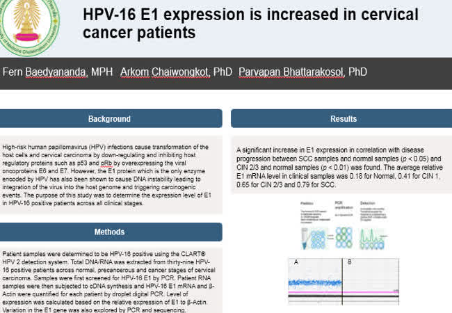 Elevated HPV16 E1 Expression is Associated with Cervical Cancer Progression เจ้าของผลงาน : Fern Baedyananda คำสำคัญ : HPV, Cervical Cancer, E1 วันที่เผยแพร่ : 18 กรกฎาคม 2561