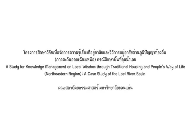 โครงการศึกษาวิจัยเพื่อจัดการความรู้ที่อยู่อาศัยและวิถีการอยู่อาศัยผ่านภูมิปัญญาท้องถิ่น(ภาคตะวันออกเฉียงเหนือ)กรณีศึกษาพื้นที่ลุ่มน้ำเลย เจ้าของผลงาน : คณะสถาปัตยกรรมศาสตร์ มหาวิทยาลัยขอนแก่น คำสำคัญ : รูปแบบที่อยู่อาศัย, ลุ่มน้ำเลย วันที่เผยแพร่ : 17 ธันวาคม 2561