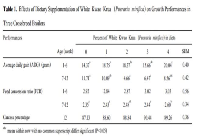 กวาวเครือขาว, สมรรถภาพการเจริญเติบโต, คอเลสเตอรอล, ไตรกลีเซอไรด์, คุณภาพซาก, ไก่เนื้อสามสายพันธุ์