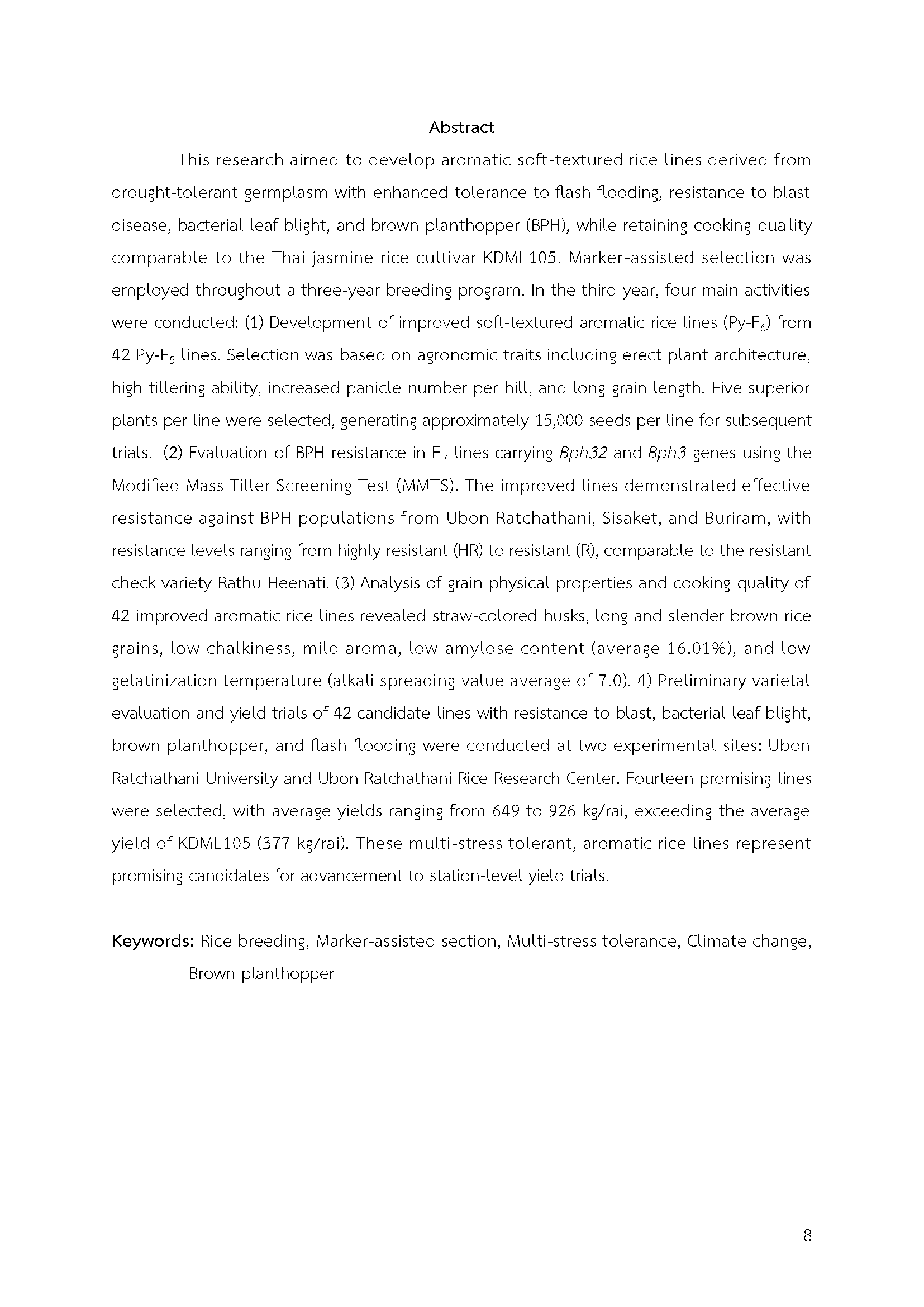 | คำสำคัญ | การปรับปรุงพันธุ์ข้าว;การใช้เครื่องหมายโมเลกุลช่วยคัดเลือก;สภาพเครียดหลายลักษณะ;สภาพอากาศวิกฤติ;เพลี้ยกระโดดสีน้ำตาล |