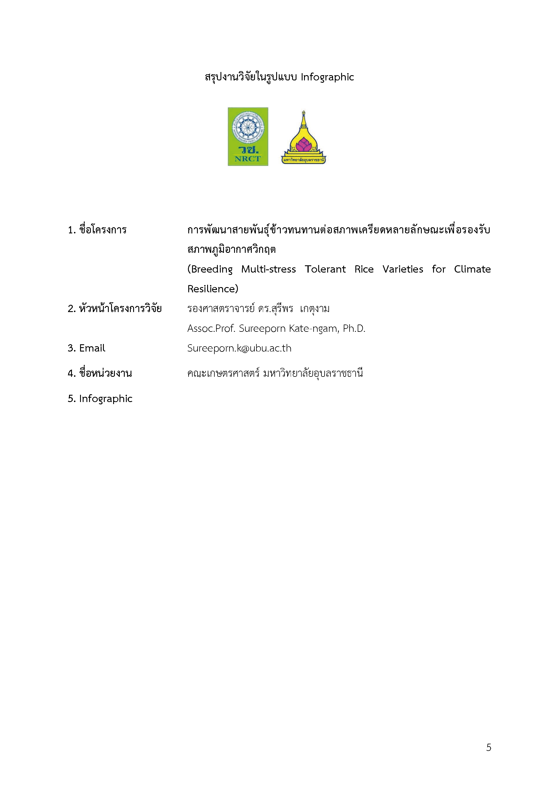 | ชื่อโครงการวิจัย/ชื่อเรื่อง | การพัฒนาสายพันธุ์ข้าวทนทานต่อสภาพเครียดหลายลักษณะเพื่อรองรับสภาพภูมิอากาศวิกฤต |
